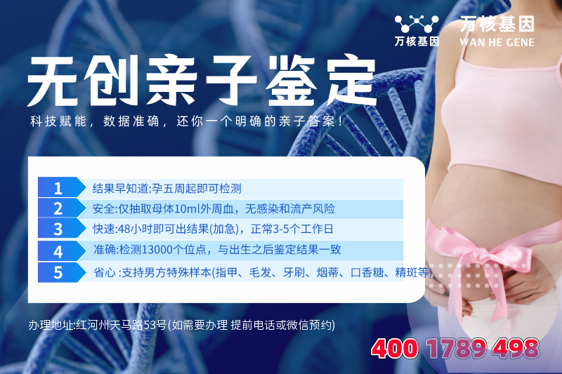 红河州个人隐私亲子鉴定办理地址:红河州天马路53号(如需要办理 提前电话或微信预约)-预约电话:4001789498,服务地区包括:个旧市、开远市、蒙自市、弥勒市、屏边苗族自治县、建水县、石屏县、泸西县、元阳县、红河县、金平苗族瑶族傣族自治县、绿春县、河口瑶族自治县等周边城市,可在线咨询:无创产前亲子鉴定、司法亲子鉴定、移民亲子鉴定、入户亲子鉴定、中考亲子鉴定、高考亲子鉴定、红河州个人隐私亲子鉴定等等咨询服务。